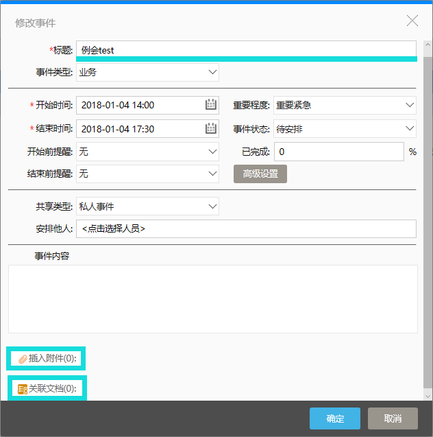 点击新建创建日程事件。 输入事件相关信息,如:事件标题、起止时间、状态、重要程度等;勾选提醒,系统会在事件开始时通知提醒;点击【高级设置】按钮出现高级设置页面,可以设置事件的完成率等信息。
