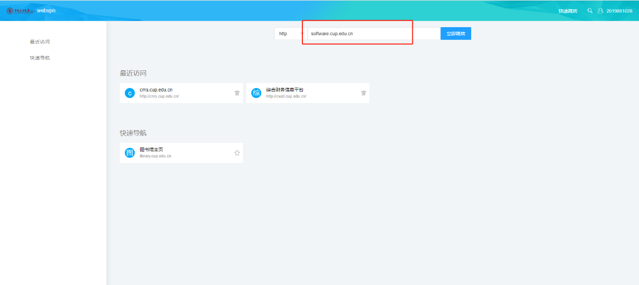 举例说明:如需访问正版化软件服务平台,可直接在搜索框内输入该网站地址:software.cup.edu.cn,点击“立即跳转”按钮,即可进入正版化软件服务平台的登录界面。如下图所示: