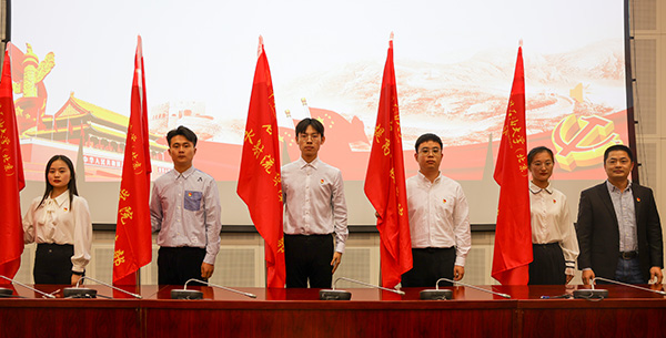 陈峰为油气工程力学师生联合党支部联合党支部书记张广清授旗。学生工作部部长庄玉琳为研究生“功能型”党支部书记代表授旗。