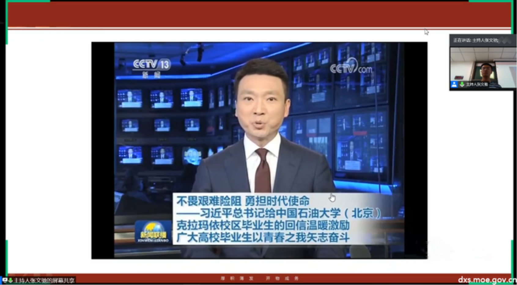 参会支部依托腾讯会议平台,实现“云”端连线,线上线下共同观看新闻联播关于习近平总书记给中国石油大学(北京)克拉玛依校区回信的报道,回顾回信内容,领悟回信精神,将习近平总书记对广大高校毕业生“不畏艰难险阻,勇担时代使命”的温暖激励铭记于心,深刻体悟对广大学子的殷切期望。